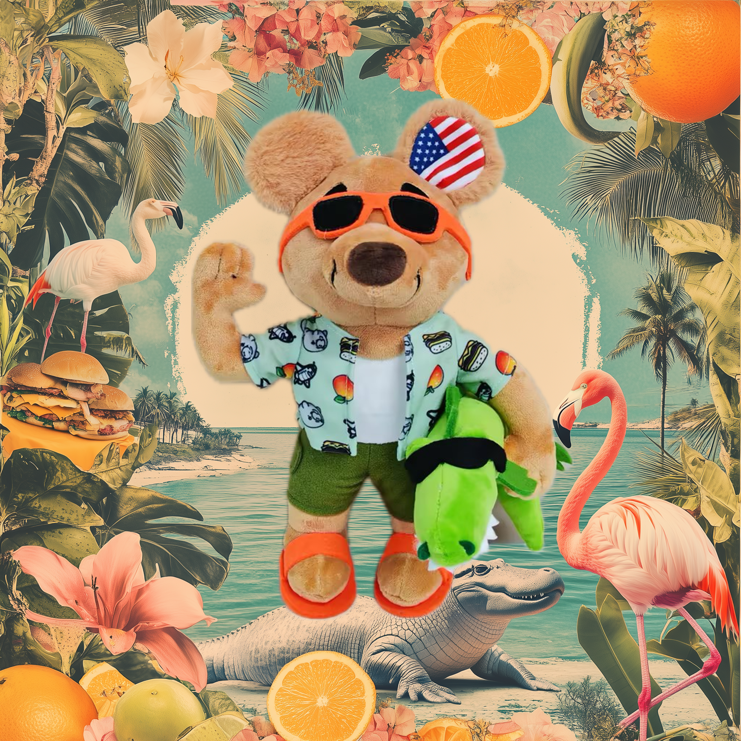 Meet Jim Bear, the ultimate Florida adventurer and his pet alligator Gator, always ready for sunshine and chill! Representing the sunny state of Florida, Jim's outfit is a carefully put together cocktail of Florida vibe. Jim's custom designed shirt features an iconic Florida pattern, made of Florida oranges, Cuban sandwiches, NASA space rockets and manatees.