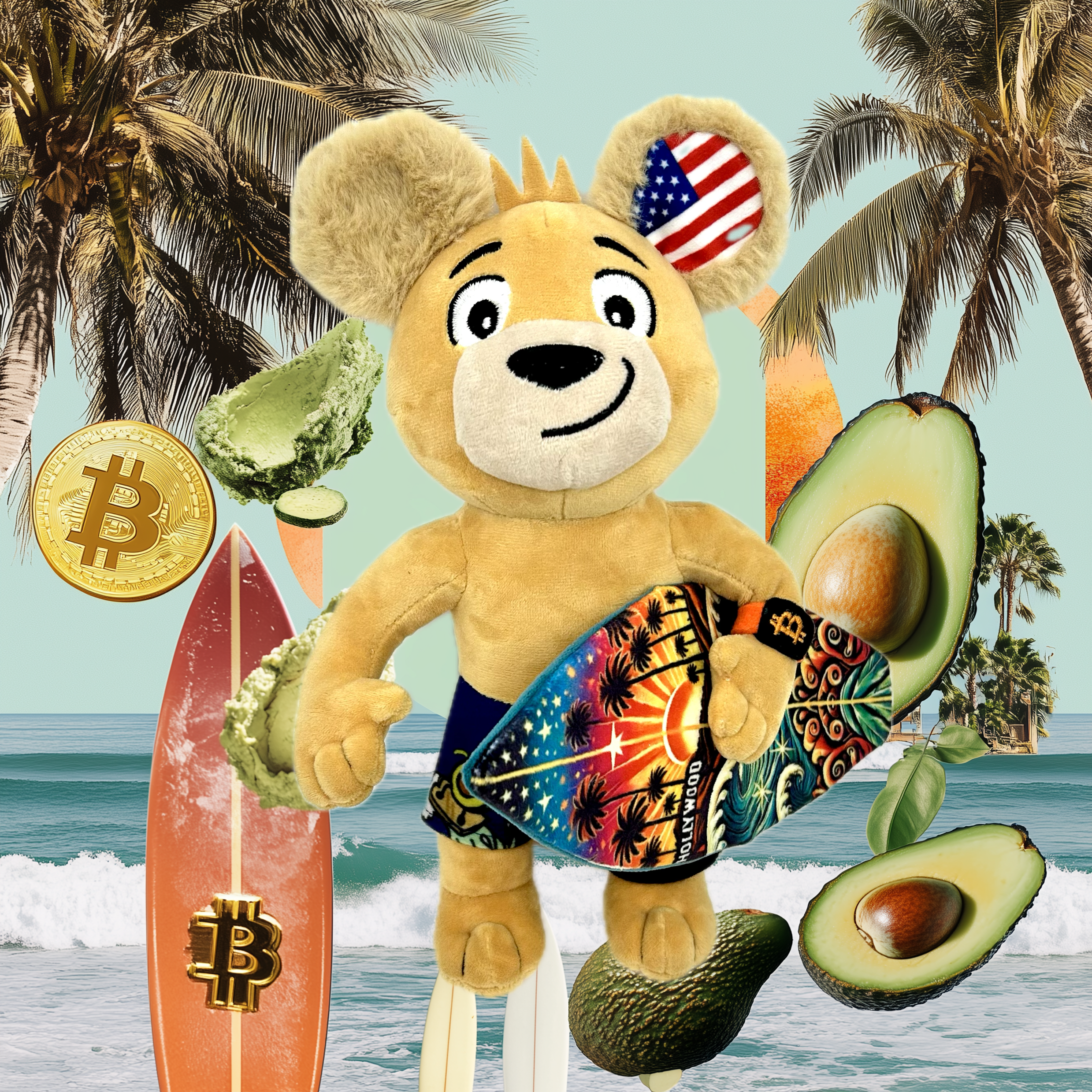 Accessories: Plush surfboard with a bold California-themed tropical design and a funky smart watch with a BITCOIN on it (a nod to California’s Silicon Valley and to having the highest concentration of bitcoin owners in the US)