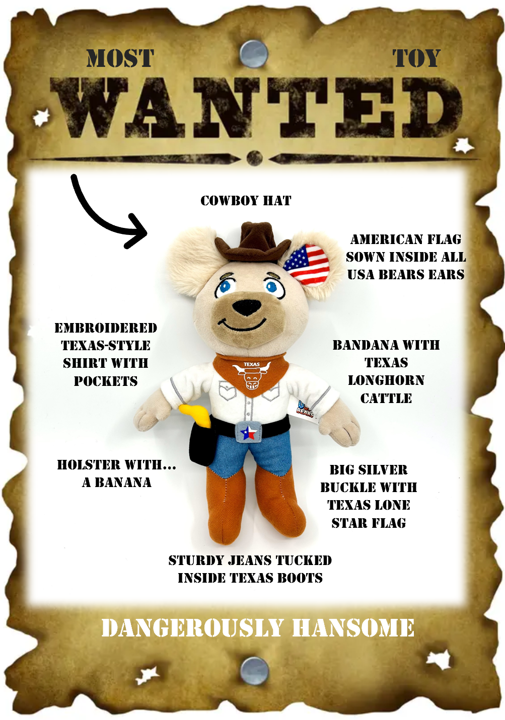 Saddle up and meet Buck the Cowboy Bear, the YEEEHAAAW legend of Texas! With his classic cowboy hat, bandana, and boots, Buck is ready to wrangle some fun and ride off into the sunset. Wait, what? Is that a banana in your holster!